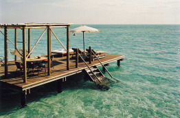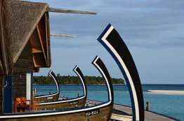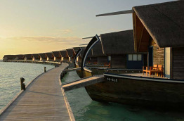8 Dhoni Suites de 75 m2 construites en forme de bateau. Le dhoni est le bateau traditionnel des Maldives. Elle est composée d’une chambre, d’un coin salon accessible en contrebas par quelques marches, et d’une terrasse privée sur la mer, dans le prolongement du salon.