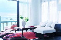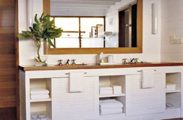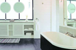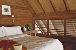10 Loft Villas de 123 m2, les dernières nées, offrant une superbe baie vitrée donnant sur le lagon. La mezzanine comprend la chambre et un cabinet de toilette, laissant le rez-de-chaussée libre pour votre confort, avec notamment de confortables sofas pour le repos. La vaste salle de bains comprend une douche extérieure, et un accès direct au lagon.