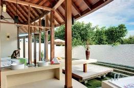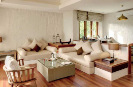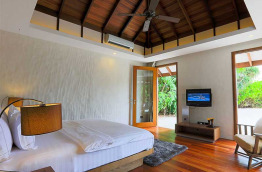 7 Sunset Beach Villas de 130 m2 nichées dans la dense végétation en bordure de mer. Le décor est rustique-contemporain mais élégant, les murs blancs contrastent avec le sol en teck et les tons de vert, beige et brun. Une belle terrasse en bois donne sur les jardins.