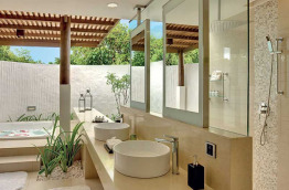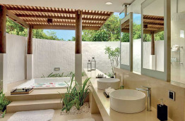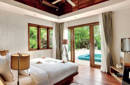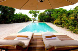 3 Two Bedroom Beach Residences with Pool de 575 m2 sont installées du côté intérieur du lagon. Elles bénéficient d'une grande piscine, une grande terrasse, un grand salon, un dressing, une immense salle de bains dans un jardin privatif. Un majordome est à votre service 24h/24.