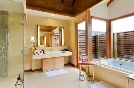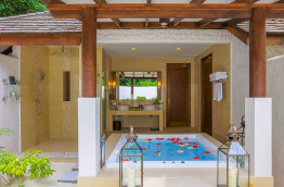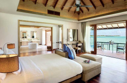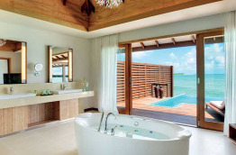 50 Deluxe Water Villas with Pool de 190 m2 avec bain à jets sont construites sur pilotis au-dessus du lagon. Elles comprennent une généreuse chambre avec coin salon, bureau et coiffeuse, une terrasse faisant face à l'océan équipée d'un coin repas, un accès direct au lagon et une petite piscine. La salle de bains est équipée d'un dressing, d'une douche séparée et d'un bain à jets.