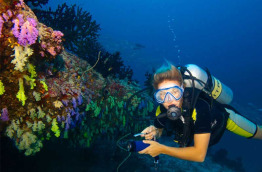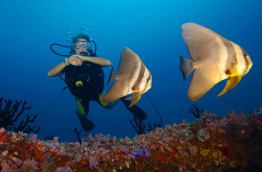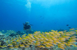 Ceux qui se contenteront du snorkeling seront ravis, le récif est très facilement accessible d’un côté de l’île, face à la marina. On est directement dans la passe, et la plus belle partie du récif se trouve en fait devant la jetée près du Meeru Bar. Il n’est pas rare de croiser des dauphins, et on peut également y voir généralement d’assez gros poissons, rien qu’avec un tuba ! Le matériel de plongée libre est mis à disposition gracieusement par l’hôtel, et le centre organise aussi des sorties de plongée libre en bateau, ainsi que des sorties guidées sur le house-reef avec supplément.