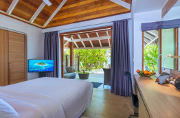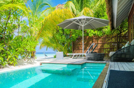 7 Ocean Pool Villas de 90 m2 qui sont les plus belles villas de Kandolhu. La terrasse est aménagée avec un escalier vers le lagon, ainsi qu’une petite piscine de 7 m2. La salle de bains est très claire, largement ouverte sur le lagon, et bénéficie d’une baignoire et d’une douche. La chambre est spacieuse et luxueuse.