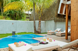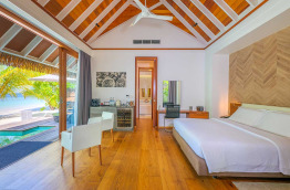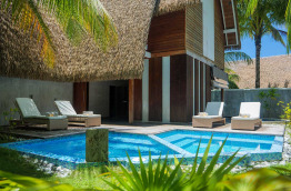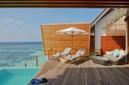 4 Deluxe Ocean Pool Villas de 120 m2, sont construites sur une jetée en arc de cercle sur pilotis au-dessus du lagon. Elles comprennent une belle chambre largement ouverte sur l’extérieur. La salle de bains fait également face au lagon, et comprend un bain à jets, et une douche, ainsi qu’un dressing. Une terrasse extérieure est équipée de bains de soleil, et d’un escalier qui mène directement au lagon.
