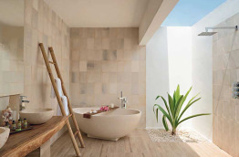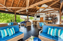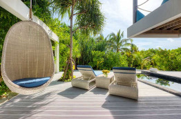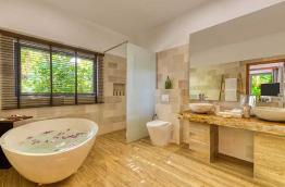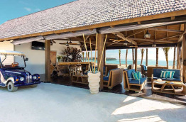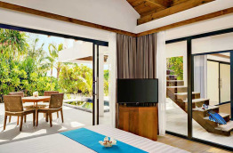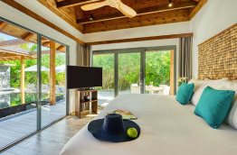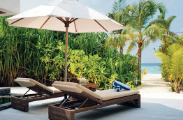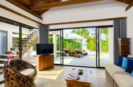 C’est directement sur la plage tout autour de l’île que se trouvent les 30 luxueuses Beach Suites de 190 m2. Elles sont également toutes identiques et bénéficient d’une petite piscine de 4 m x 2,2 m sur la terrasse, face à la mer mais protégée par la végétation environnante pour préserver votre intimité. Le plan de la villa est sensiblement différent de celui des villas sur pilotis. Vous bénéficiez d’un vrai salon séparé de la chambre, et la salle de bains est plus petite, mais elle est ouverte sur l’extérieur. À l’extérieur, un escalier permet d’accéder à une seconde terrasse de 9 m2 qui surplombe et offre parfois une vue dégagée sur la mer, mais souvent brouillée par la végétation. Les villas du côté coucher de soleil peuvent profiter de la superbe lumière du couchant.