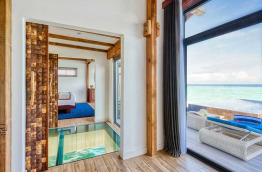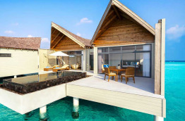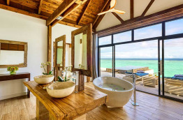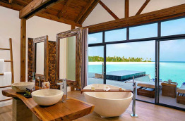 Les 72 villas sur pilotis se dressent sur 4 jetées qui forment un U au-dessus du grand lagon. Avec une surface de 140 m2, elles sont conçues pour profiter pleinement de la vue, et c’est ce qui frappe quand vous poussez la porte de votre villa, vous êtes happés par le panorama en face de vous, et par le lagon que vous pouvez admirer sous vos pieds, à travers le sol en verre du couloir de l’entrée. La salle de bains est très grande et donne sur la terrasse. Les lavabos sont installés au centre de la pièce, ainsi, vous pourrez admirer le paysage en vous brossant les dents. La chambre est pourvue d’un lit king-size orienté vers la mer, plus un coin salon ; elle bénéficie également d’un accès direct à la terrasse.
