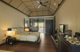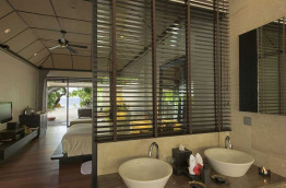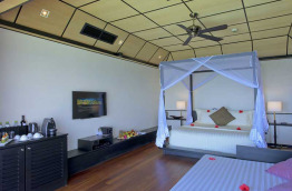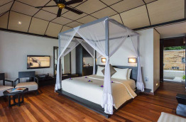 16 Lagoon Villas de 90 m2 sont construites sur pilotis en bord de plage, à la fois sur la plage et au-dessus du lagon. La terrasse est équipée de chaises longues et donne directement sur l’eau avec un accès à la mer. Cette villa bénéficie d’une salle de bains semi-ouverte sur l’extérieur, et d’un lit à baldaquin.