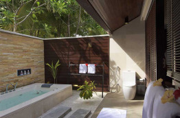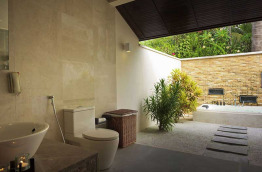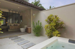 46 Beach Villas de 68 m2 sont nichées dans la végétation, les pieds dans le sable. La salle de bains, semi-ouverte sur l’extérieur, est équipée d’une baignoire. Quant à la chambre, elle possède également un lit de repos complémentaire.