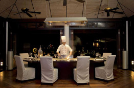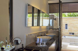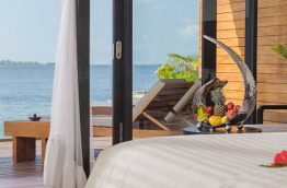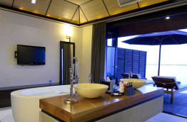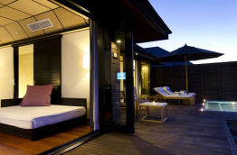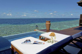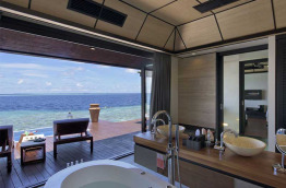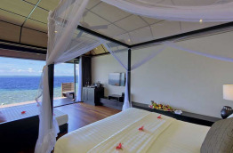 36 Deluxe Water Villas with Plunge Pool de 126 m2, sont construites sur pilotis au-dessus du lagon ; vous pourrez même observer les fonds marins par une partie du plancher en verre. Vous pouvez accéder directement au lagon depuis votre terrasse ; celle-ci est équipée d’une petite piscine bain à jets de 7 m2. La salle de bains intérieure est largement ouverte afin de profiter de la vue. Votre chambre est équipée d’un lit à baldaquin, ainsi que d’un lit de repos pour la journée, et un système TV home cinéma.