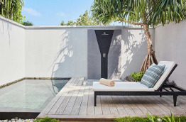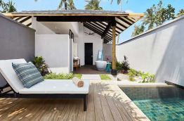 6 Beach Villas with Private Pool de 121 m2, offrant une plus grande salle de bains pourvue d’une petite piscine privée dans l’intimité de votre jardin intérieur… des chaises longues sont également à disposition autour de la piscine.