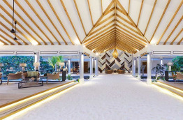Quand on débarque sur la jetée, on est accueilli dans un magnifique espace de réception, les pieds dans le sable, très haut de plafond et largement ouvert sur l’extérieur. La décoration est chic et sobre, tout comme le reste de l’hôtel.