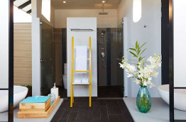 La salle de bains est particulièrement réussie car elle est très largement ouverte sur l’extérieur, chose rare dans les villas sur pilotis en général, avec en outre des filets au-dessus de l’eau. Elle comprend une baignoire, une douche intérieure, plus une douche en plein air.