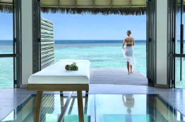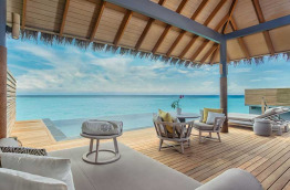 5 Overwater Pool Villas de 200 m2 qui peuvent se réserver pour un couple qui cherche plus d’espace et souhaite une piscine privée sur la terrasse. Comme les précédentes, tout est largement ouvert sur le lagon et elles disposent en plus d’un petit salon de lecture.