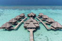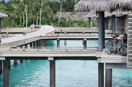 Sur pilotis au-dessus du lagon, il y a 59 villas. La décoration et la disposition sont identiques aux villas sur l’île.