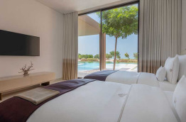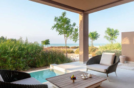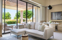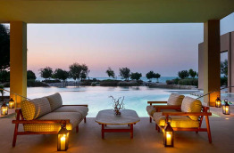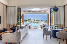1 Qataf Suite est la plus luxueuse, avec trois chambres, une piscine à débordement avec vue sur la mer, un sauna et de vastes espaces communs.